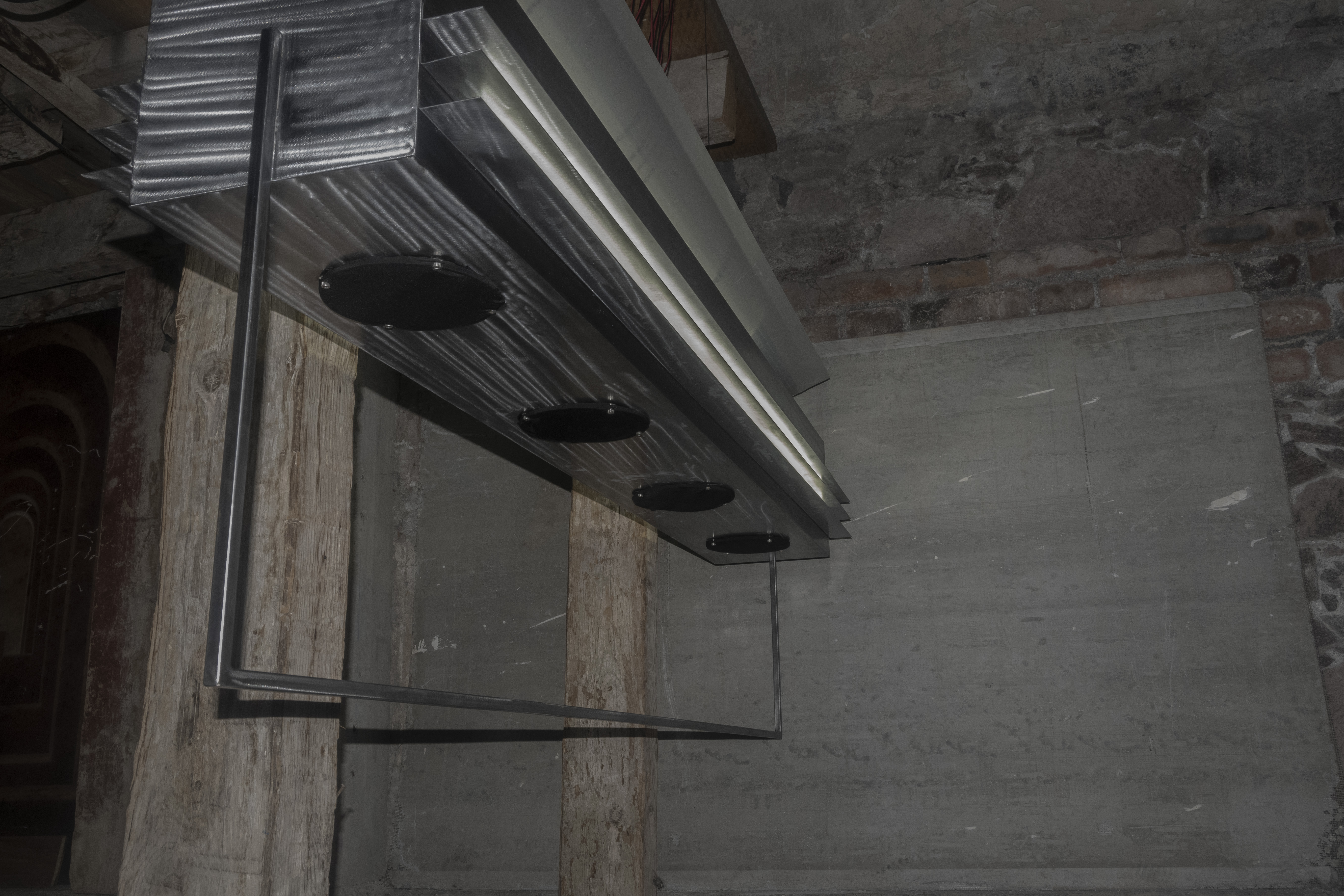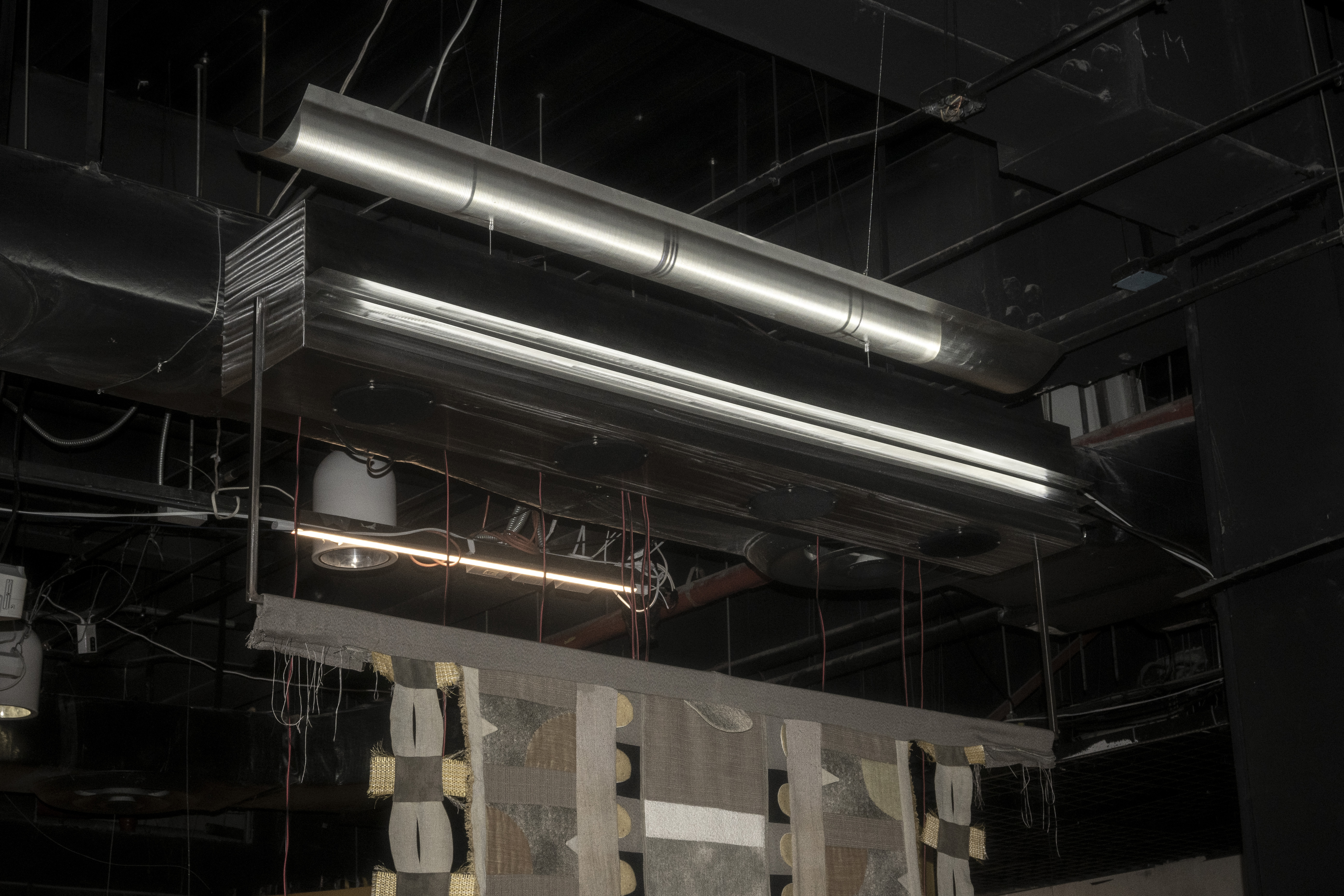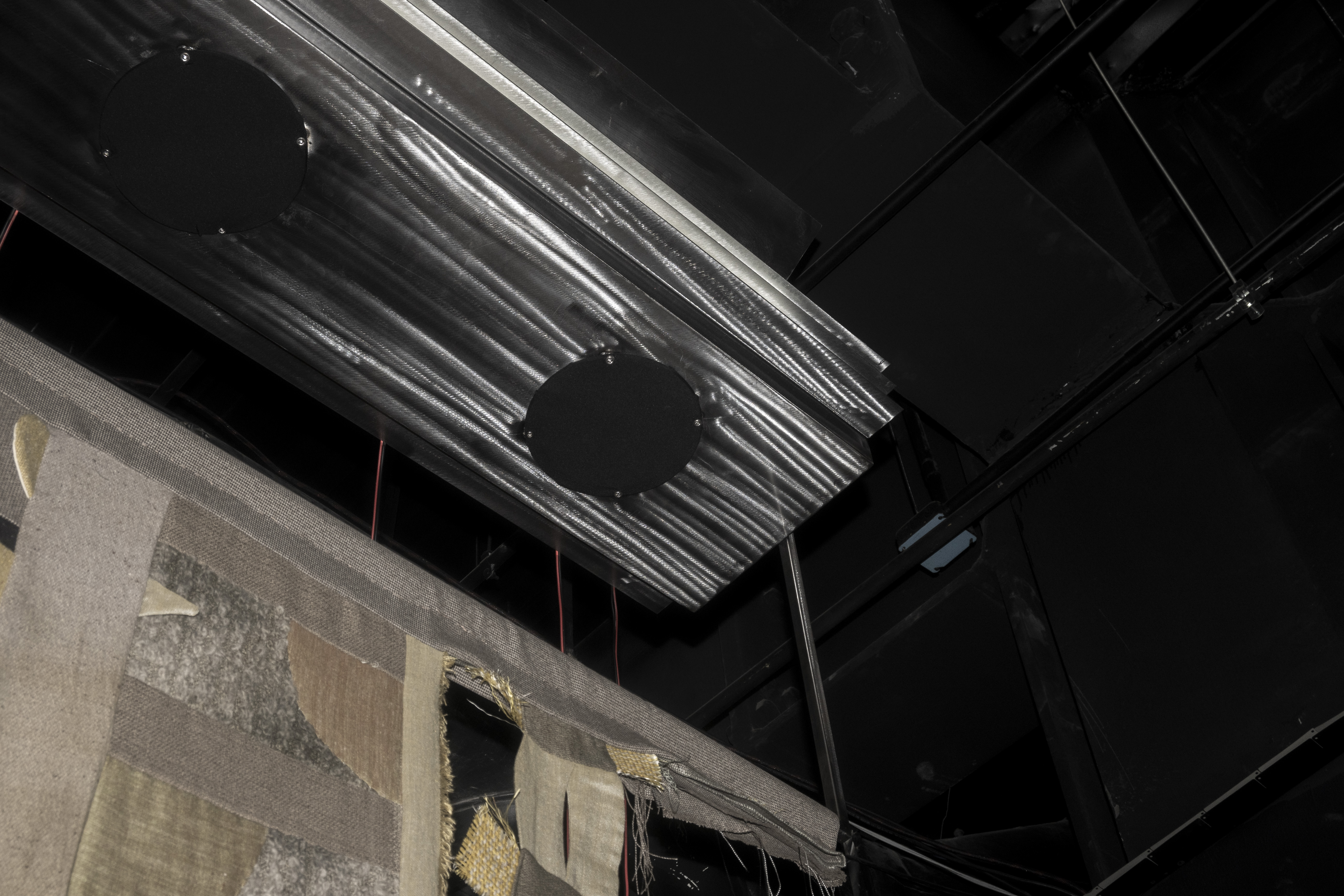 it integrates four downward-facing coaxial speakers to immerse the textile with sound, and an indirect lighting system with multiple diffusion points.