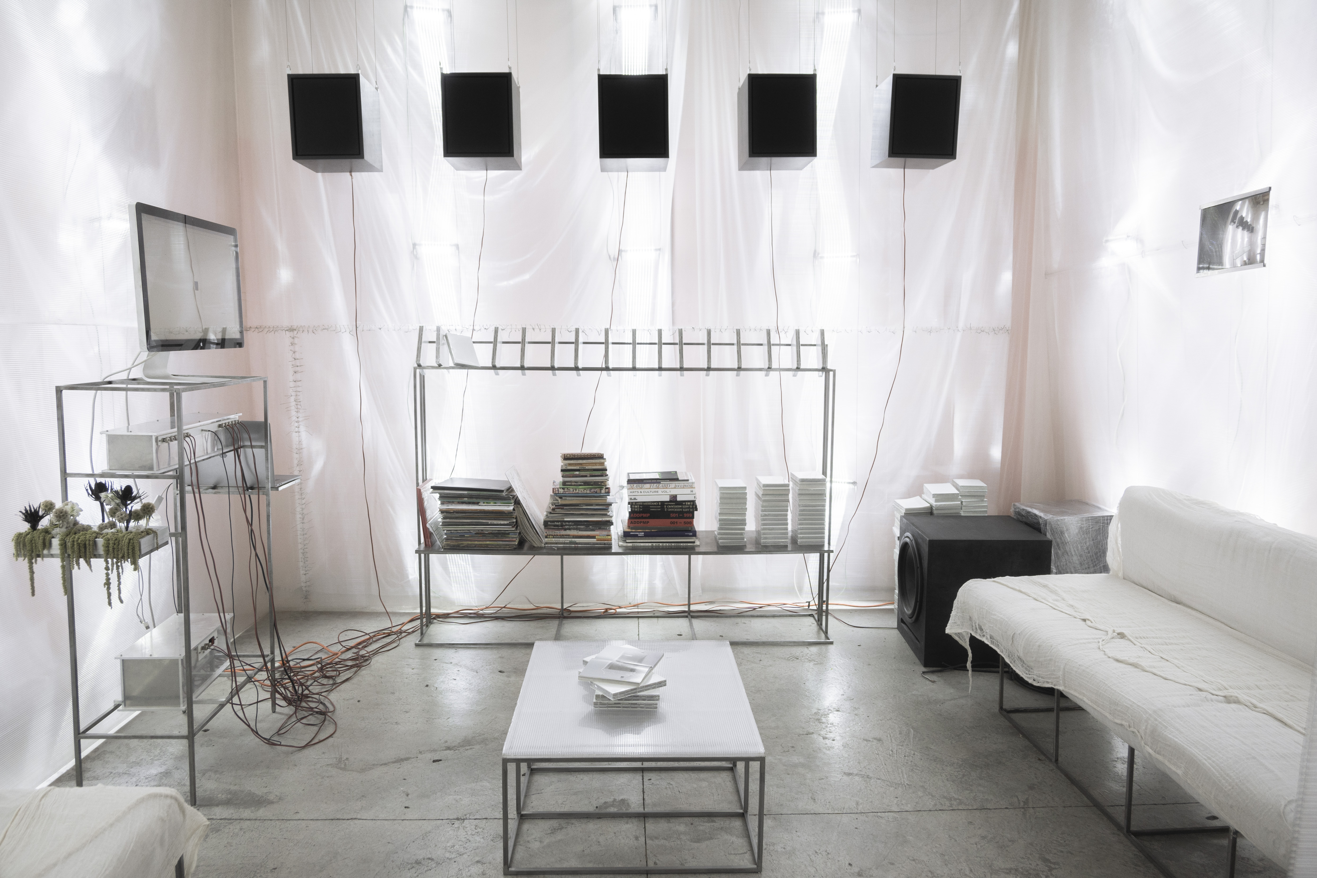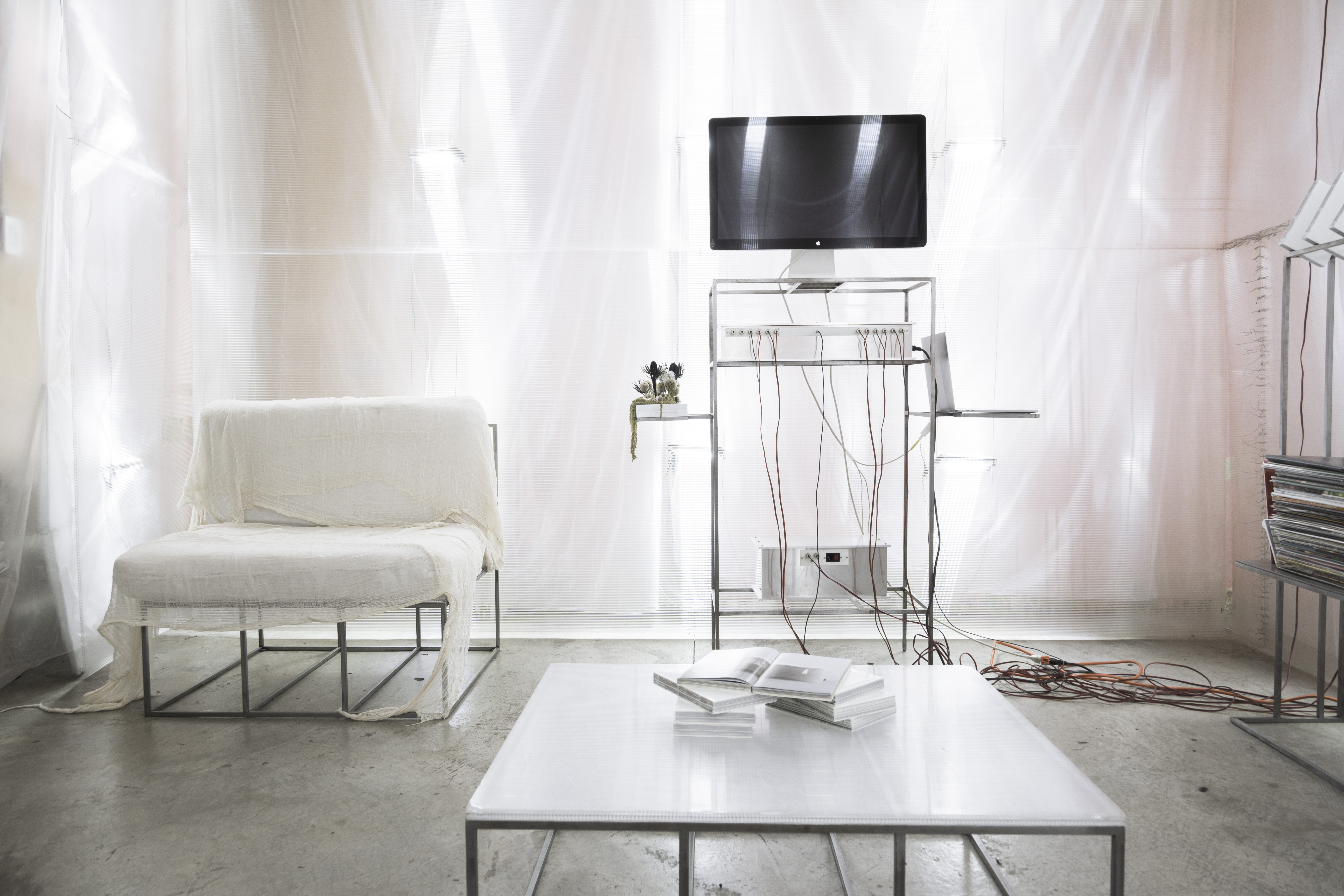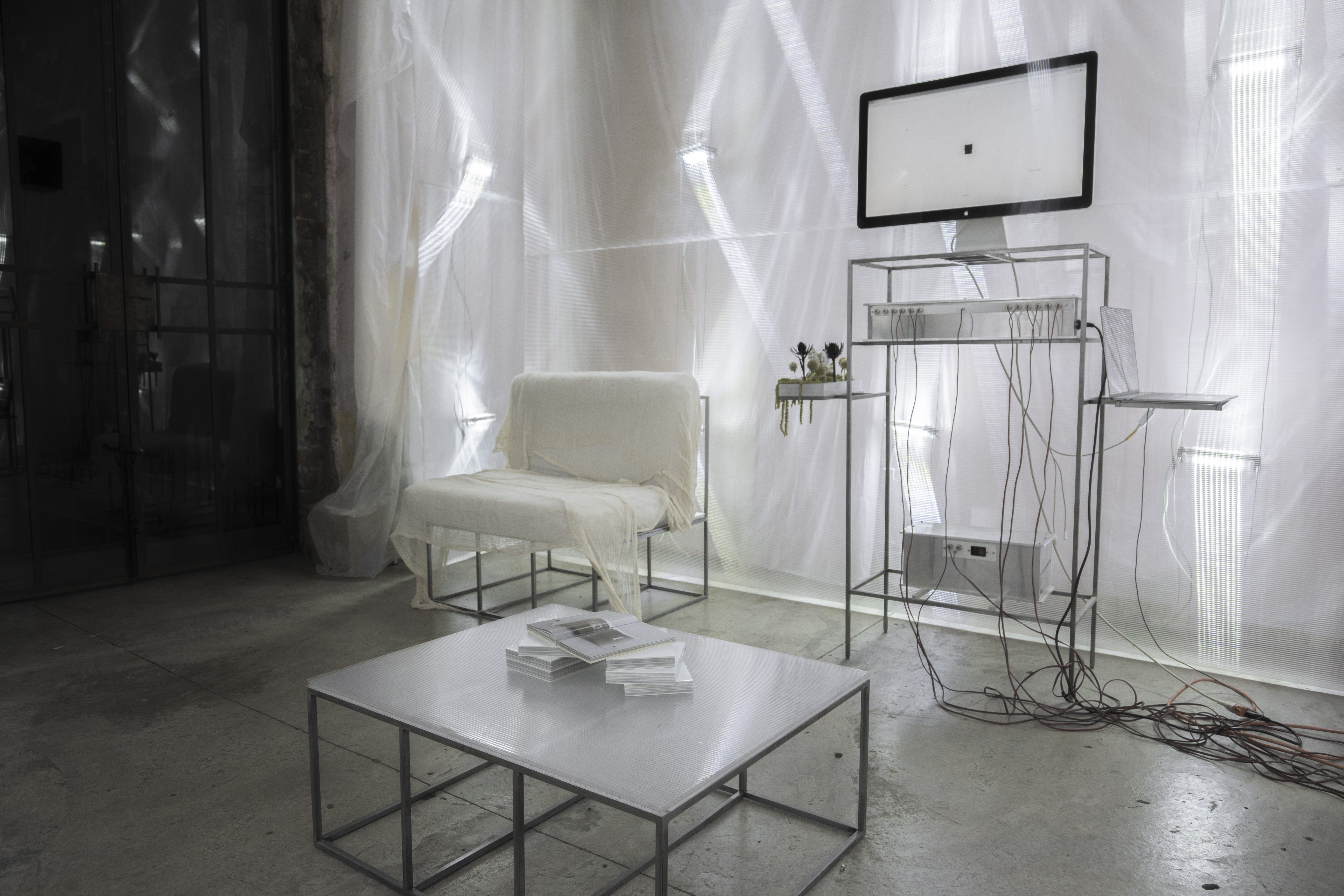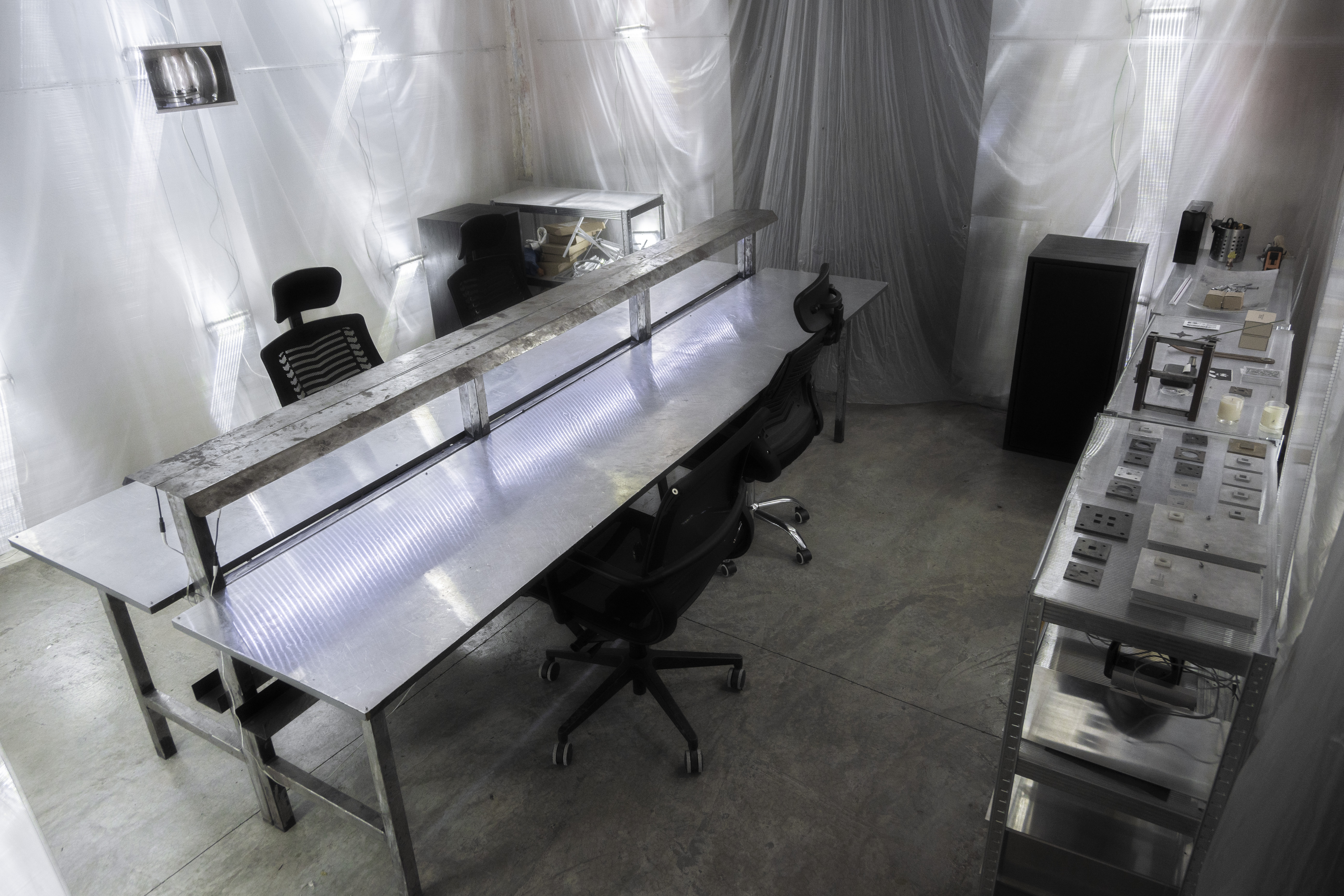 in addition to the suspended system, specific auxiliary pieces were designed: work tables, storage furniture, lamps, individual chairs and low tables. all components follow a common structural logic based on slender metal profiles and translucent materials, keeping the entire setup light, permeable and reconfigurable.