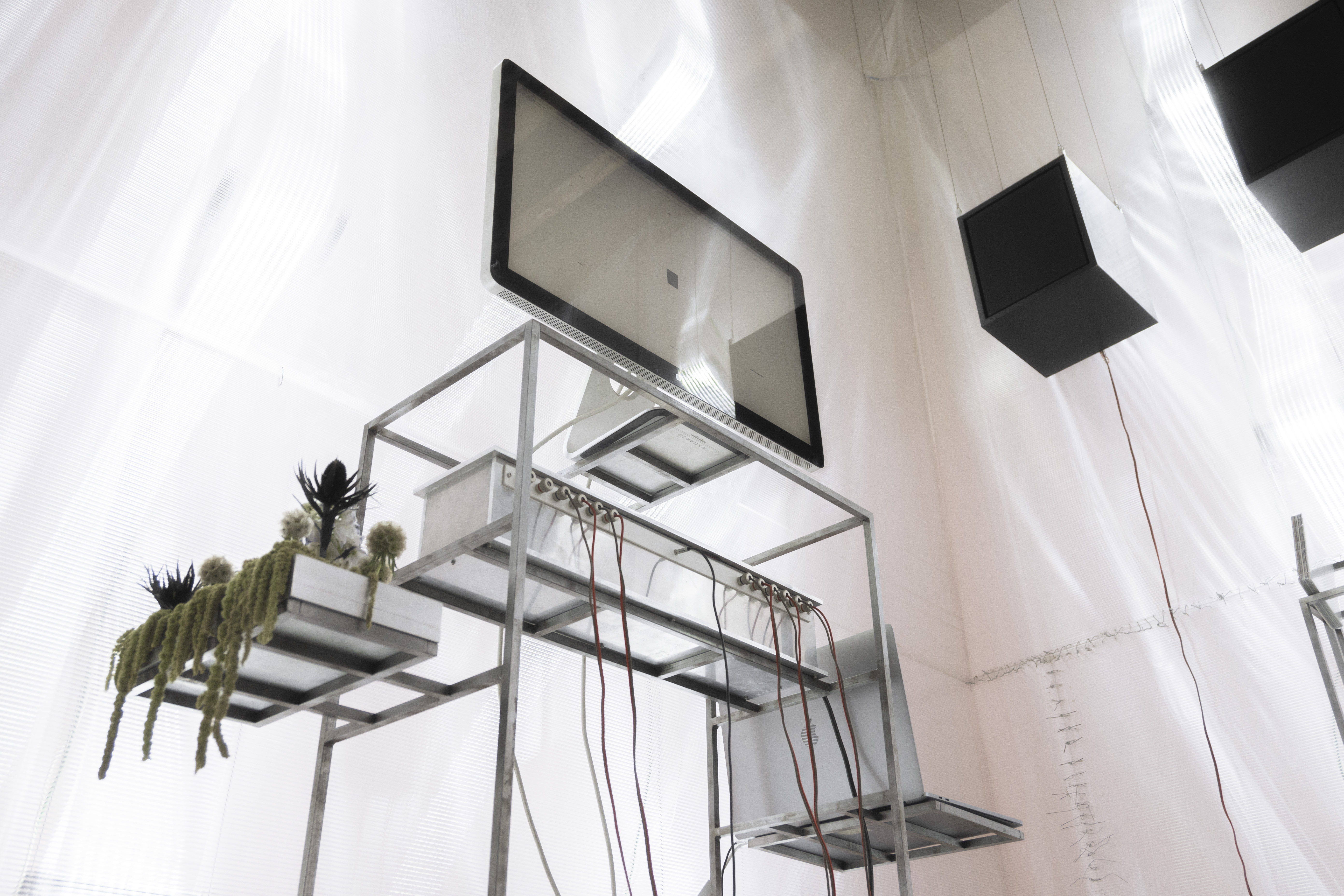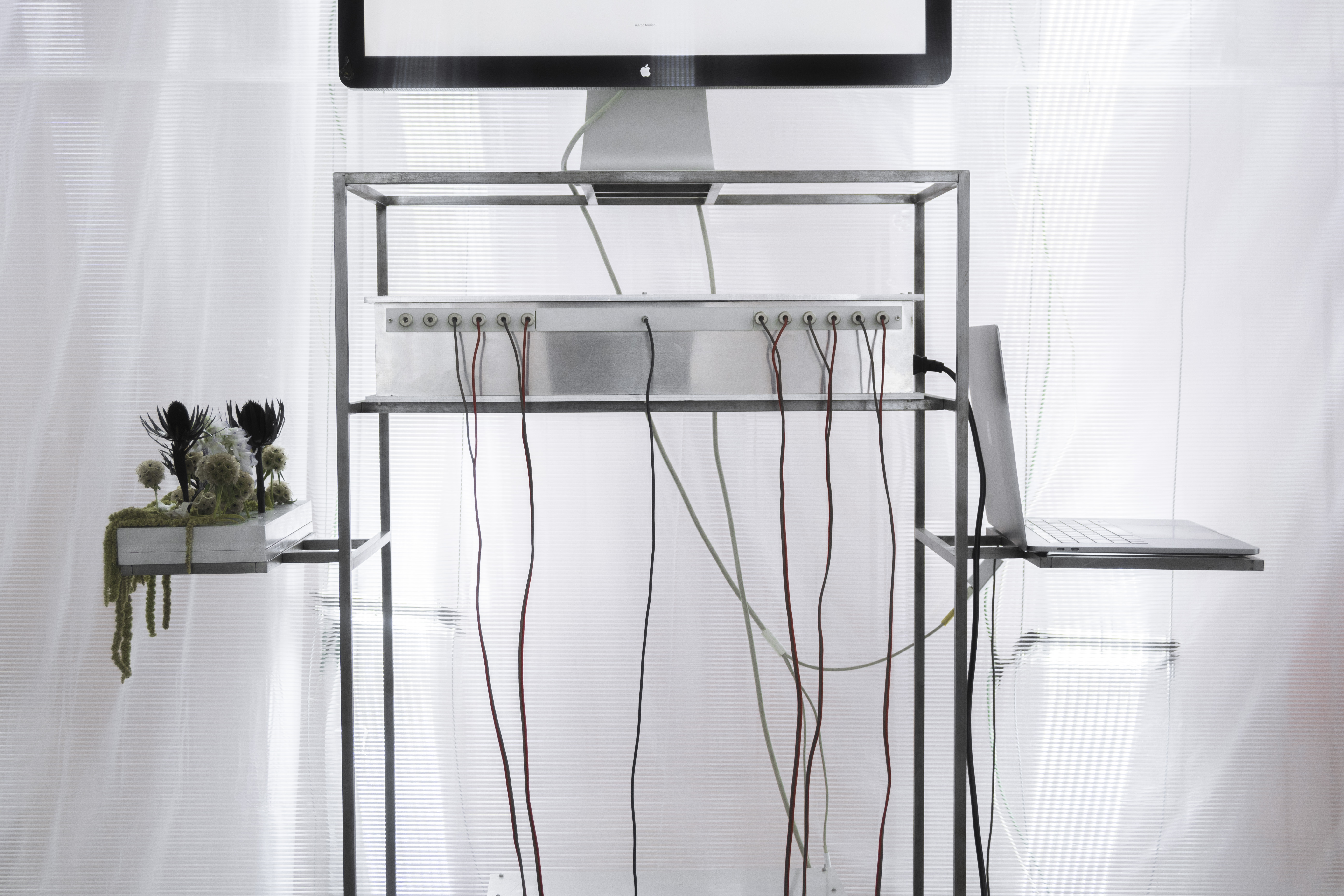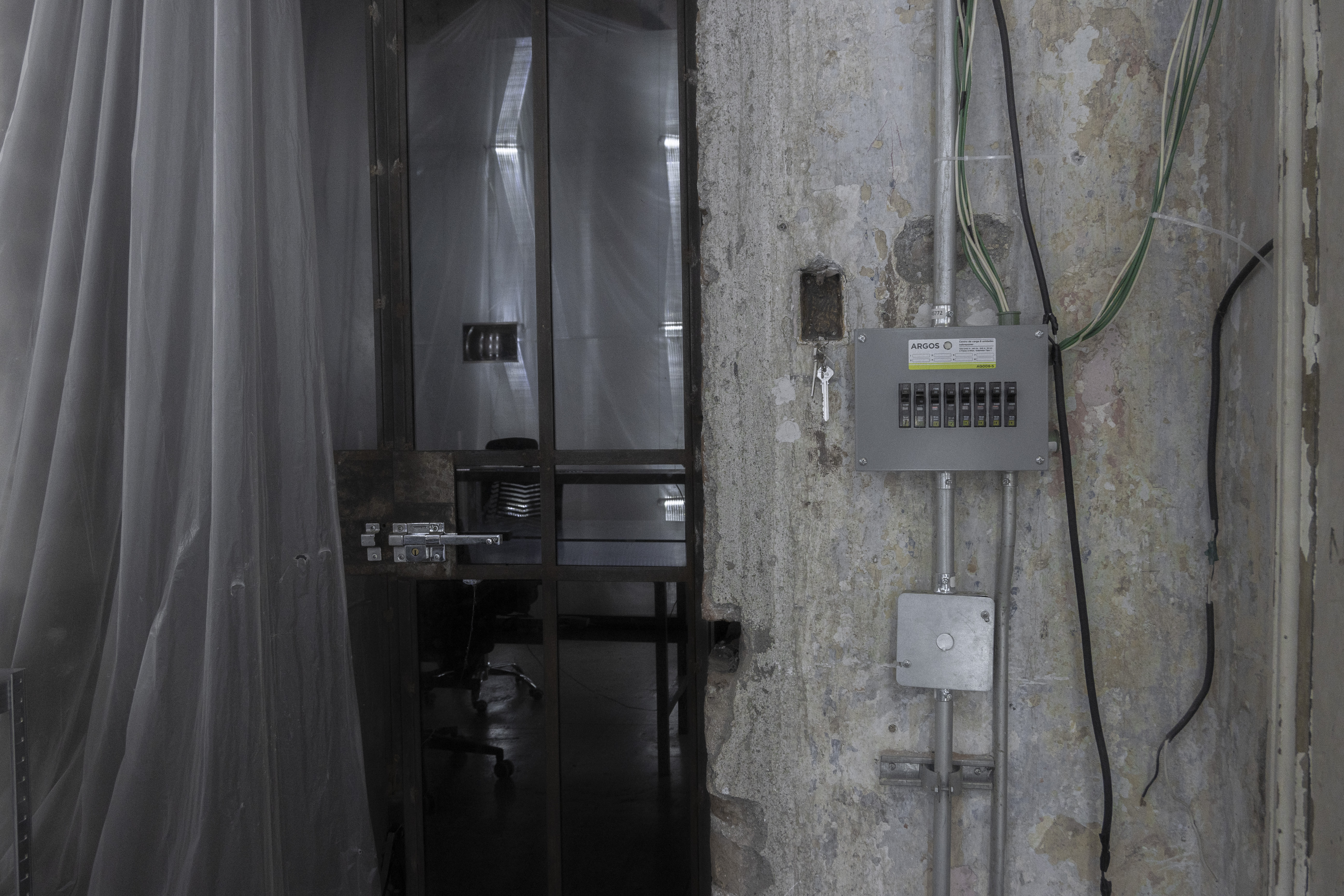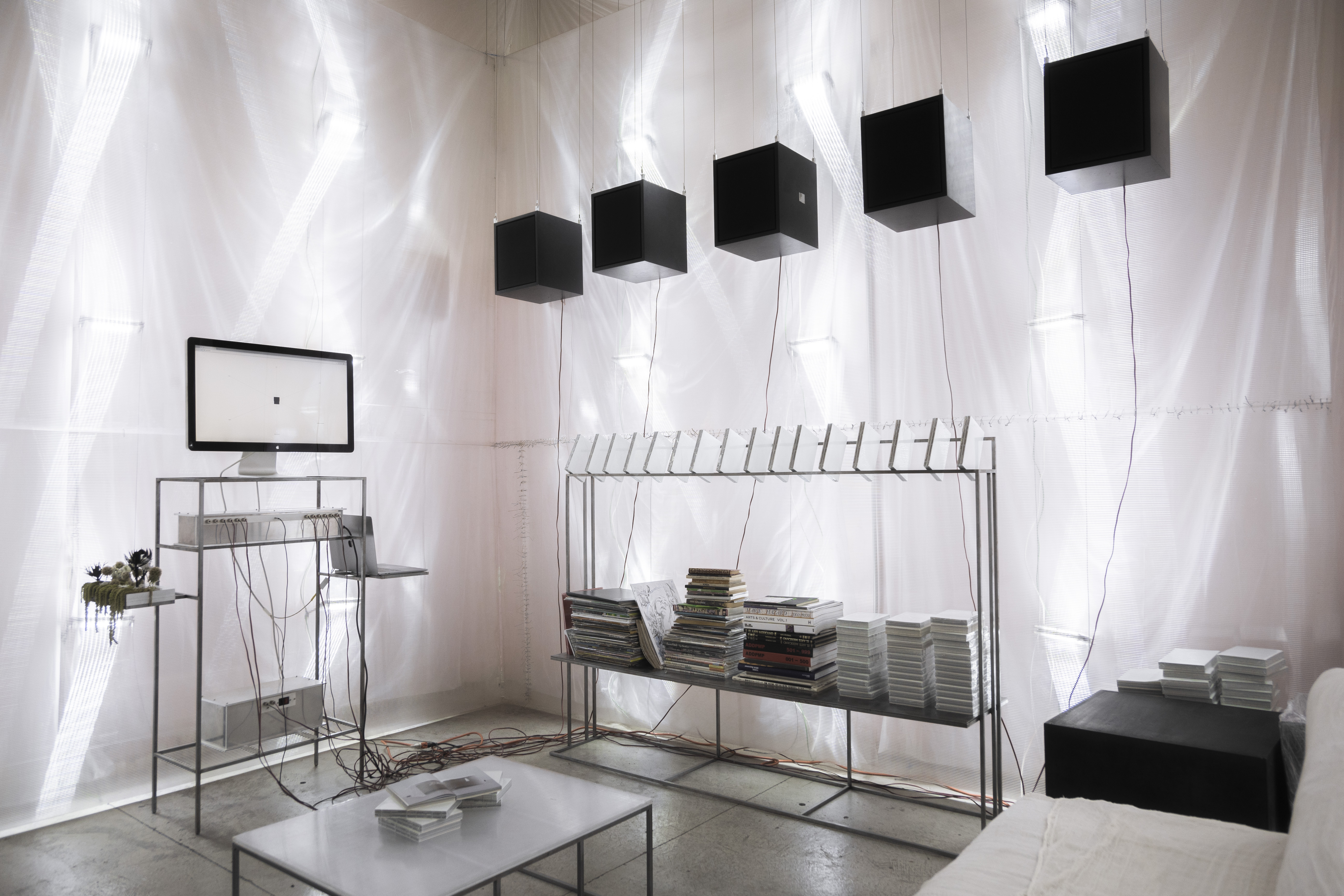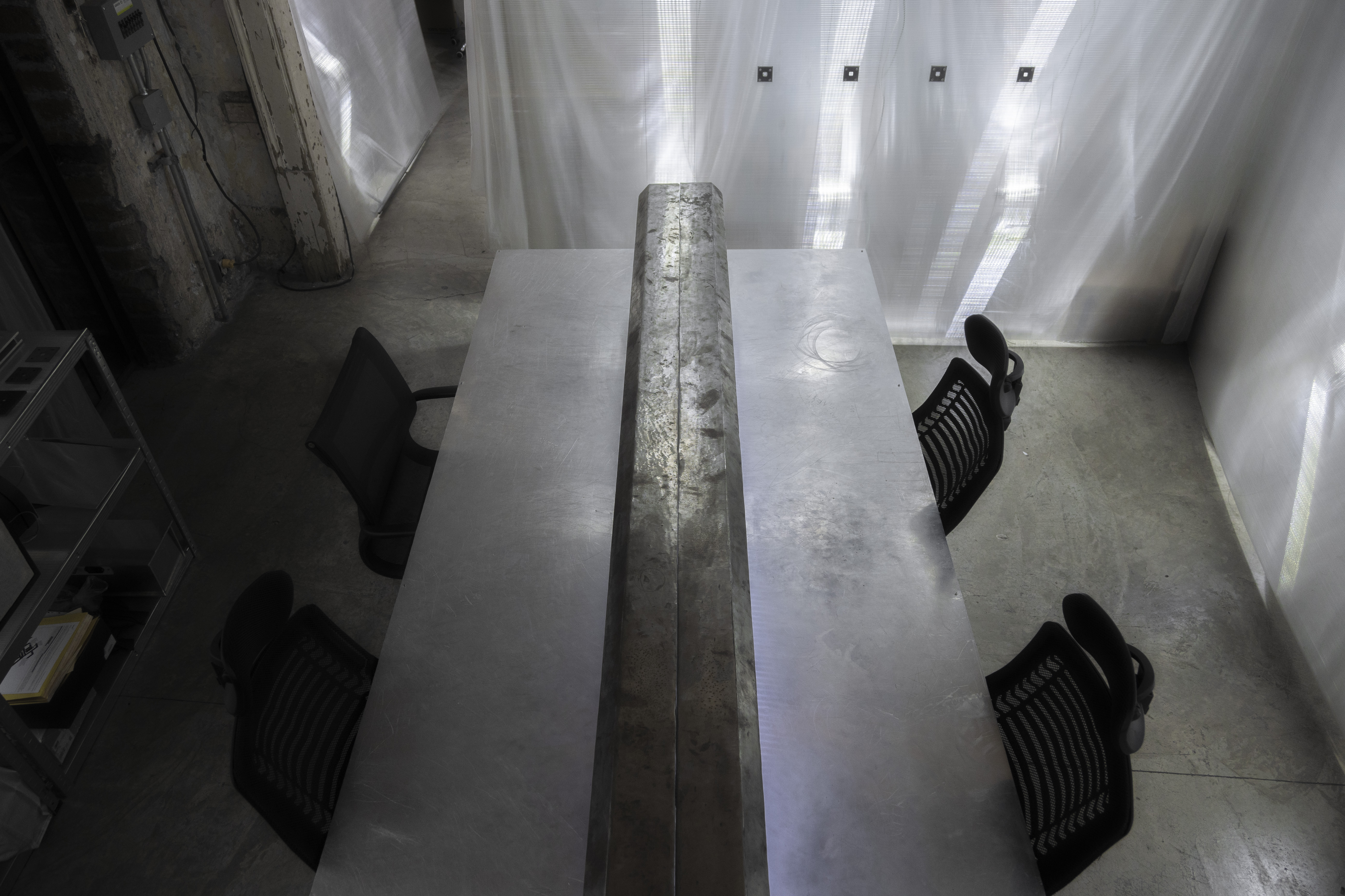 in addition to the suspended system, specific auxiliary pieces were designed: work tables, storage furniture, lamps, individual chairs and low tables. all components follow a common structural logic based on slender metal profiles and translucent materials, keeping the entire setup light, permeable and reconfigurable.