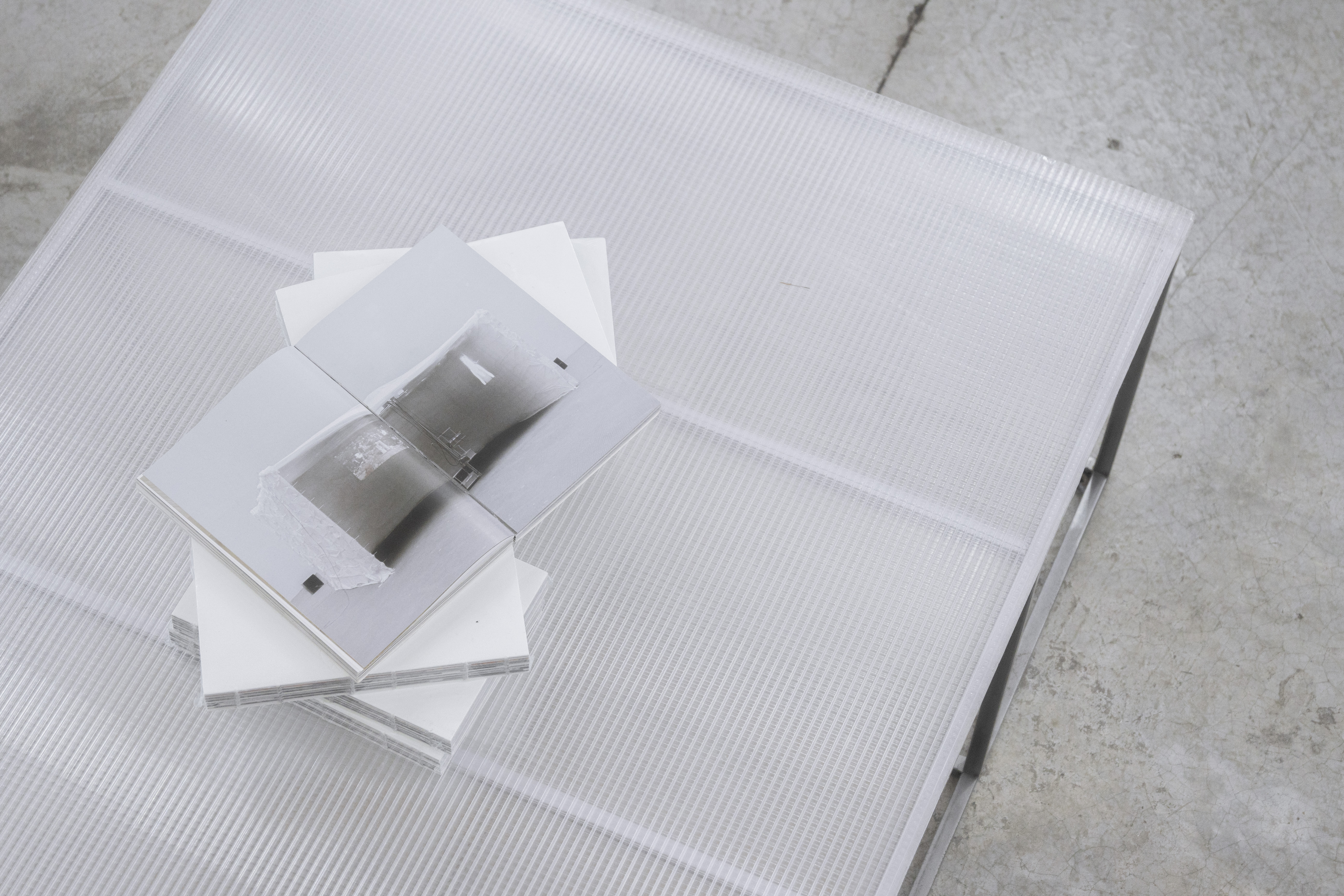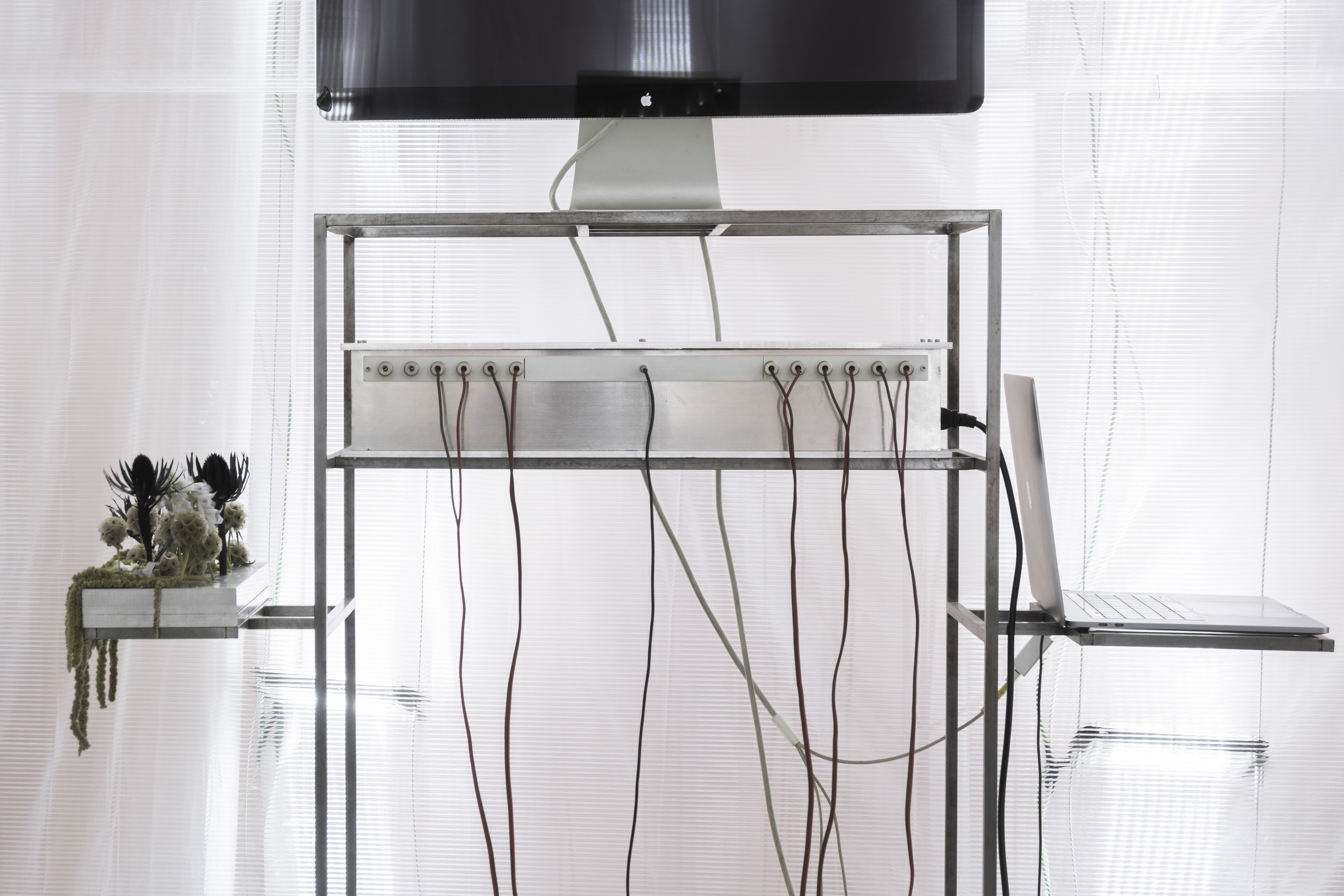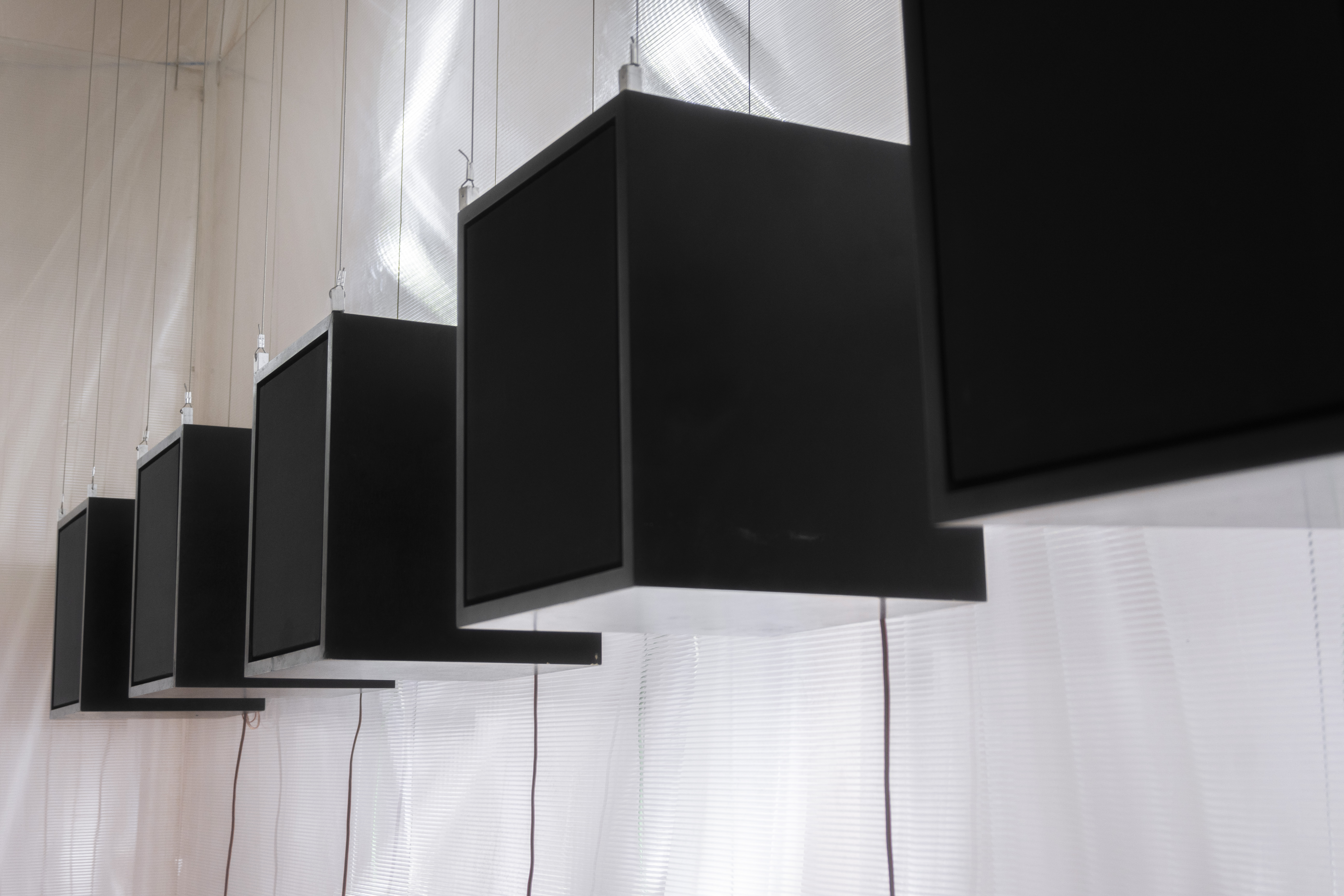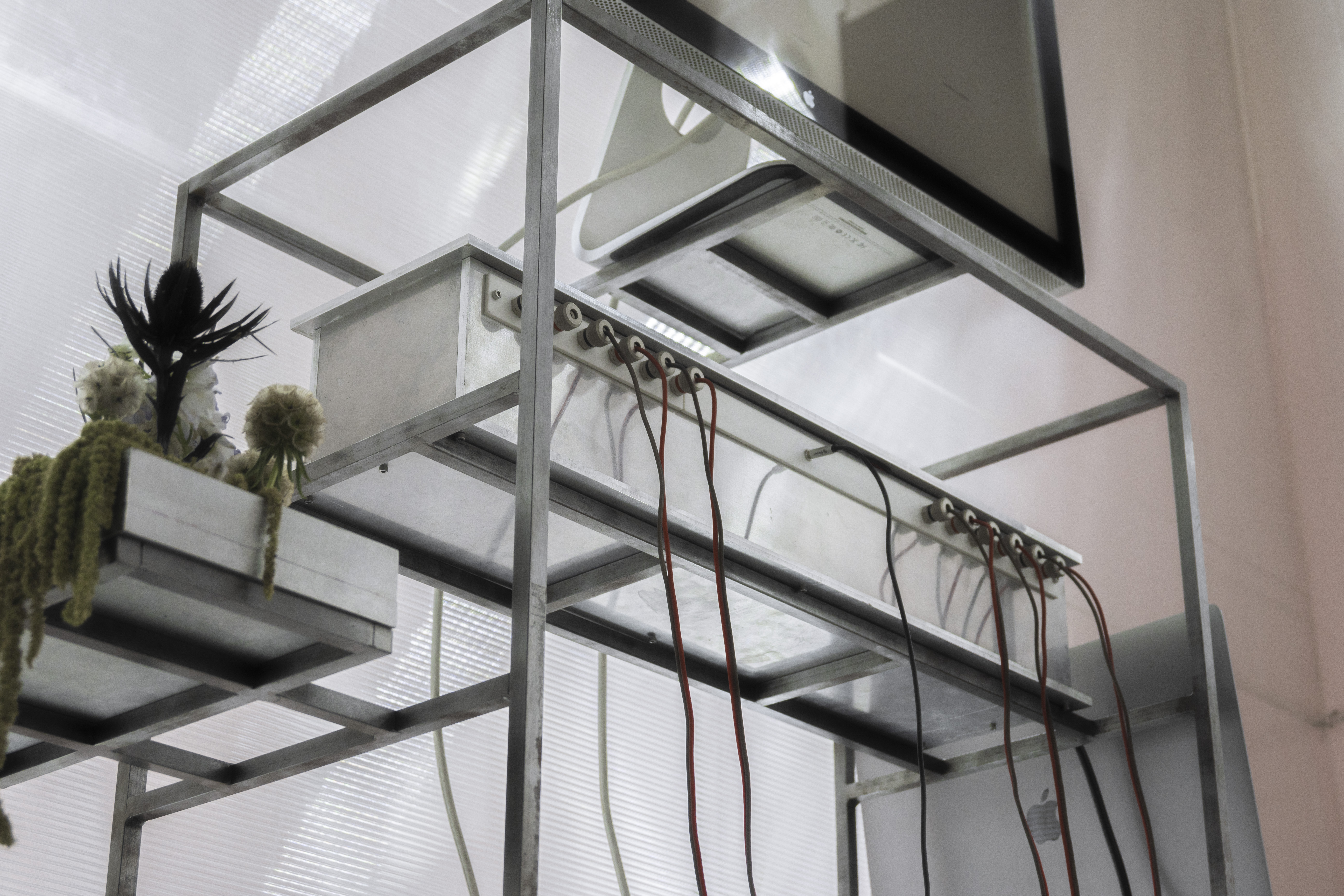 in addition to the suspended system, specific auxiliary pieces were designed: work tables, storage furniture, lamps, individual chairs and low tables. all components follow a common structural logic based on slender metal profiles and translucent materials, keeping the entire setup light, permeable and reconfigurable.