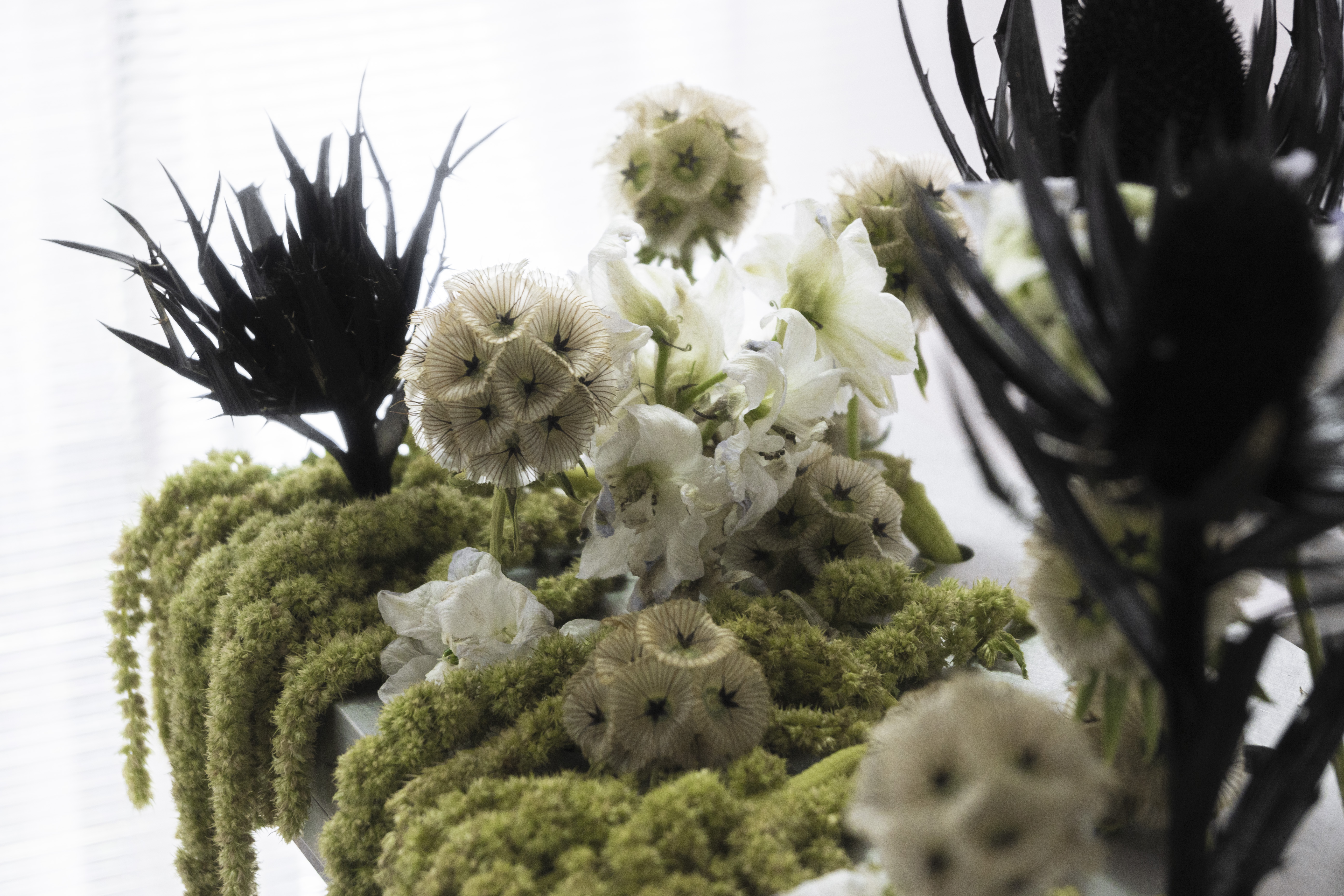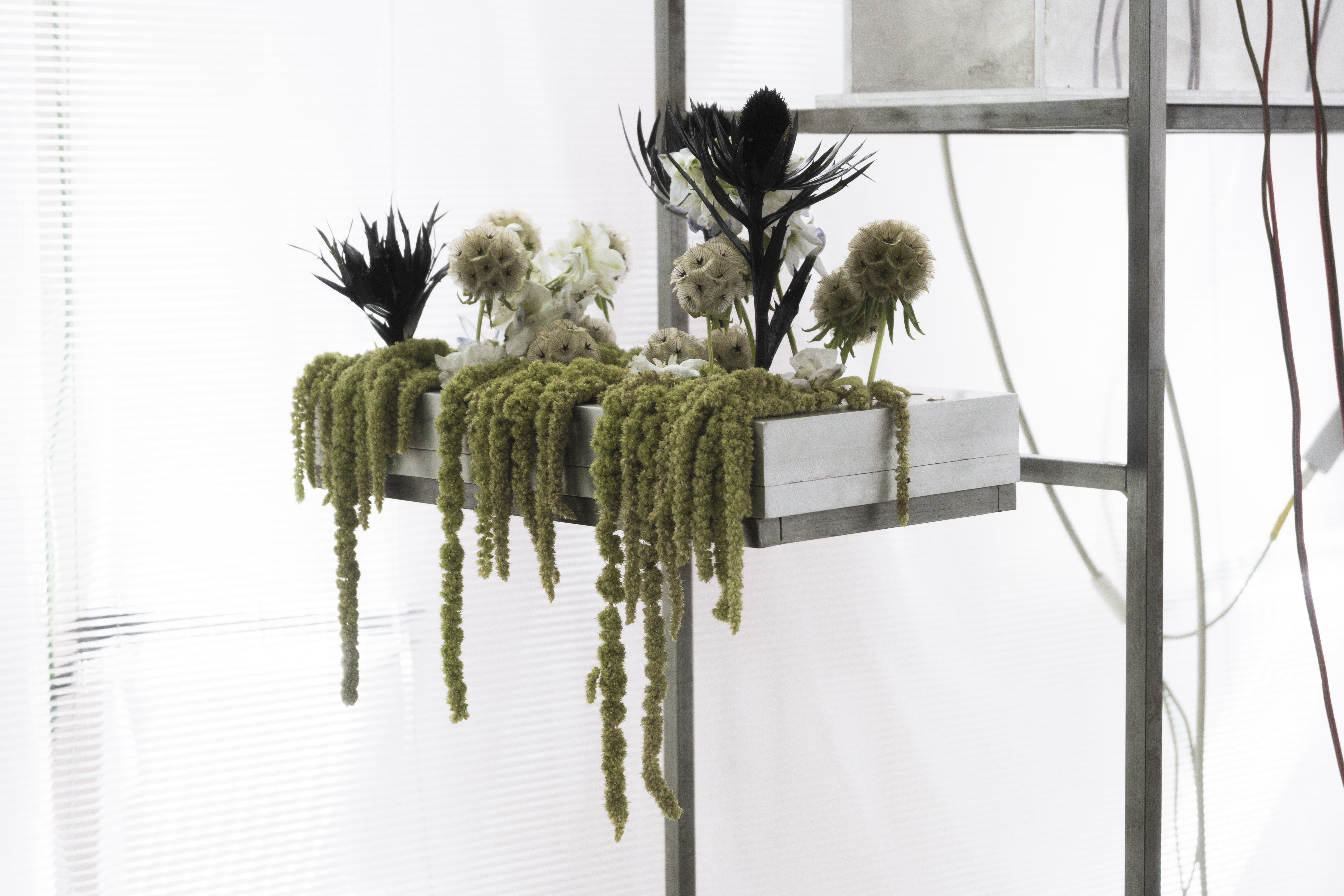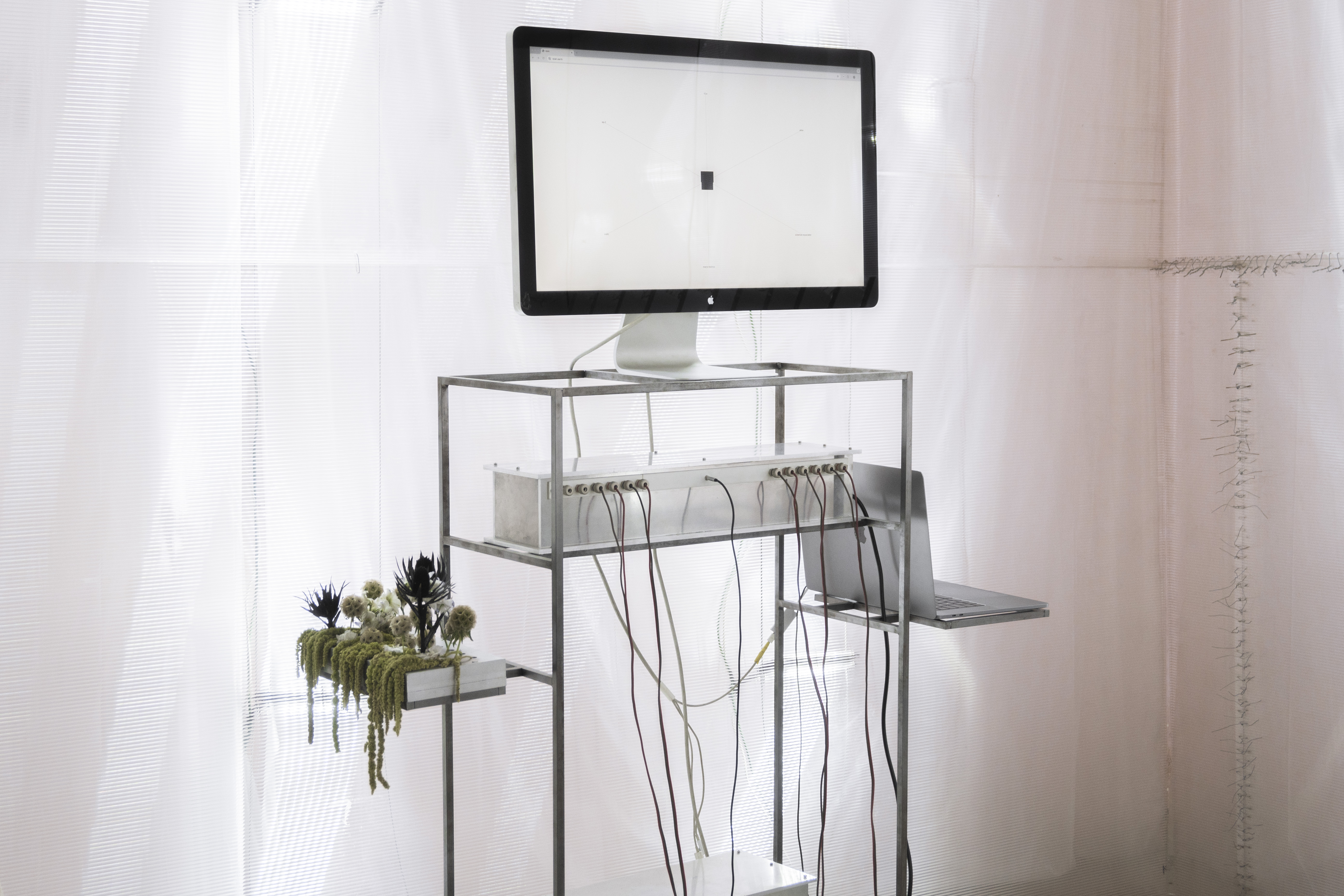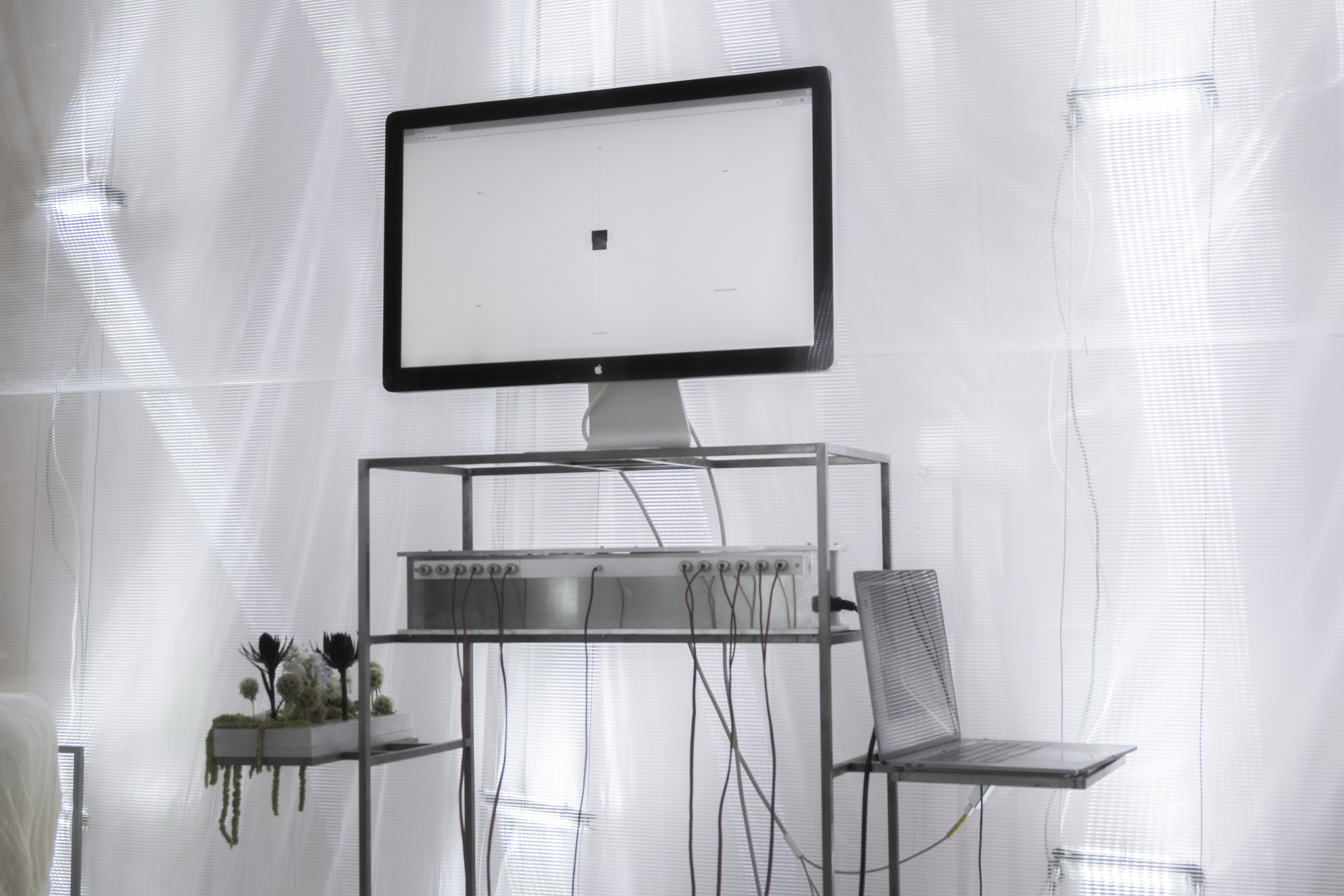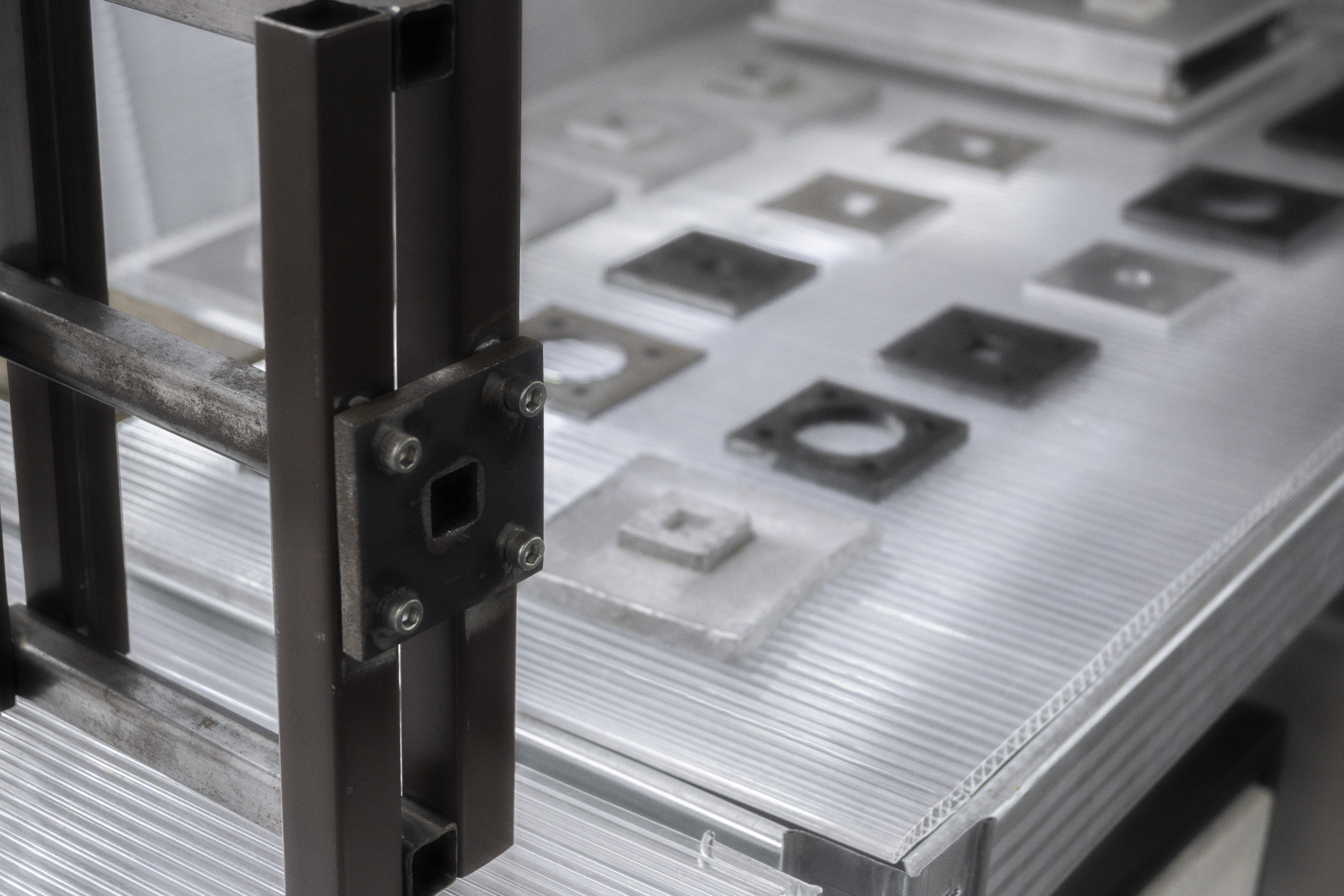 in addition to the suspended system, specific auxiliary pieces were designed: work tables, storage furniture, lamps, individual chairs and low tables. all components follow a common structural logic based on slender metal profiles and translucent materials, keeping the entire setup light, permeable and reconfigurable.