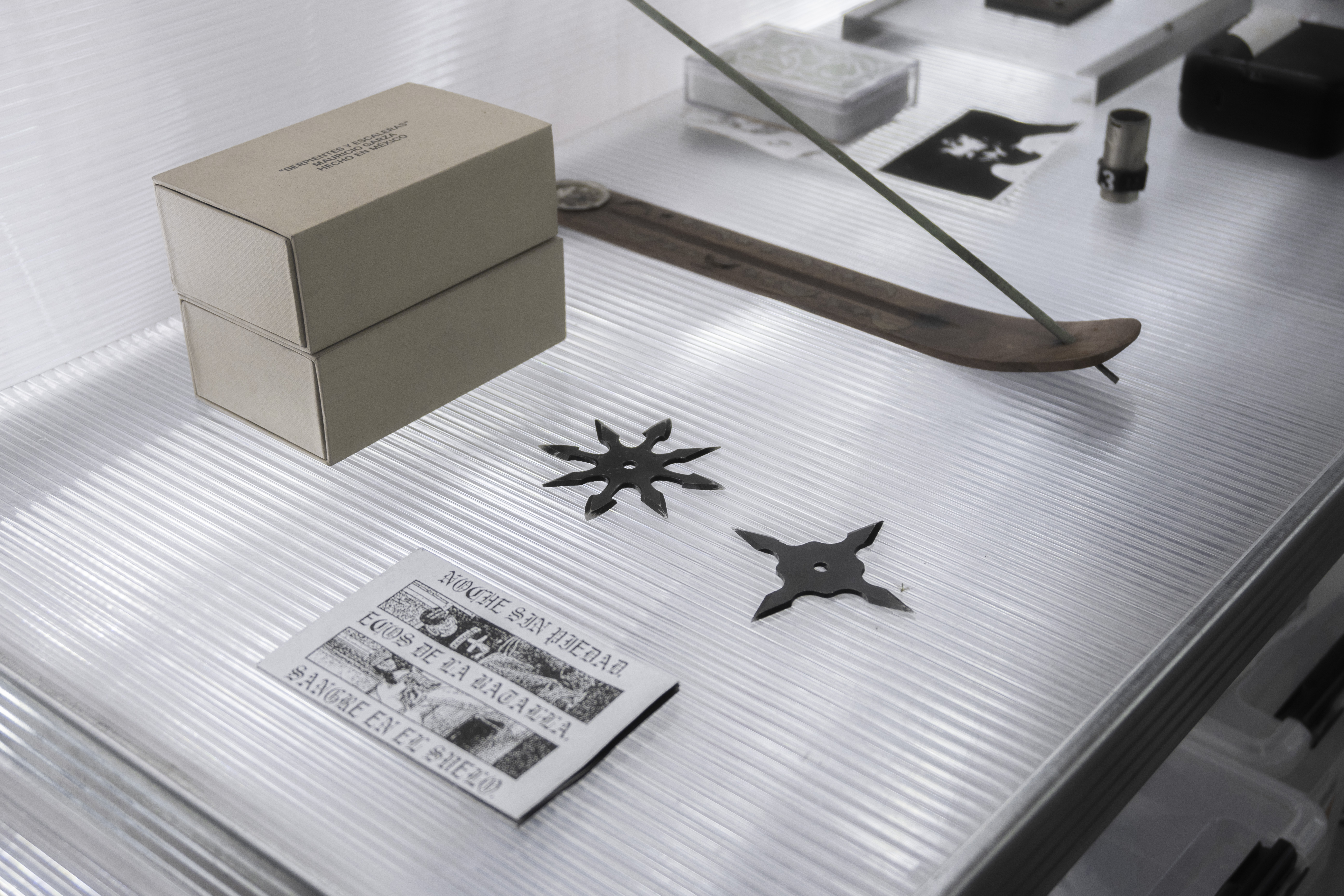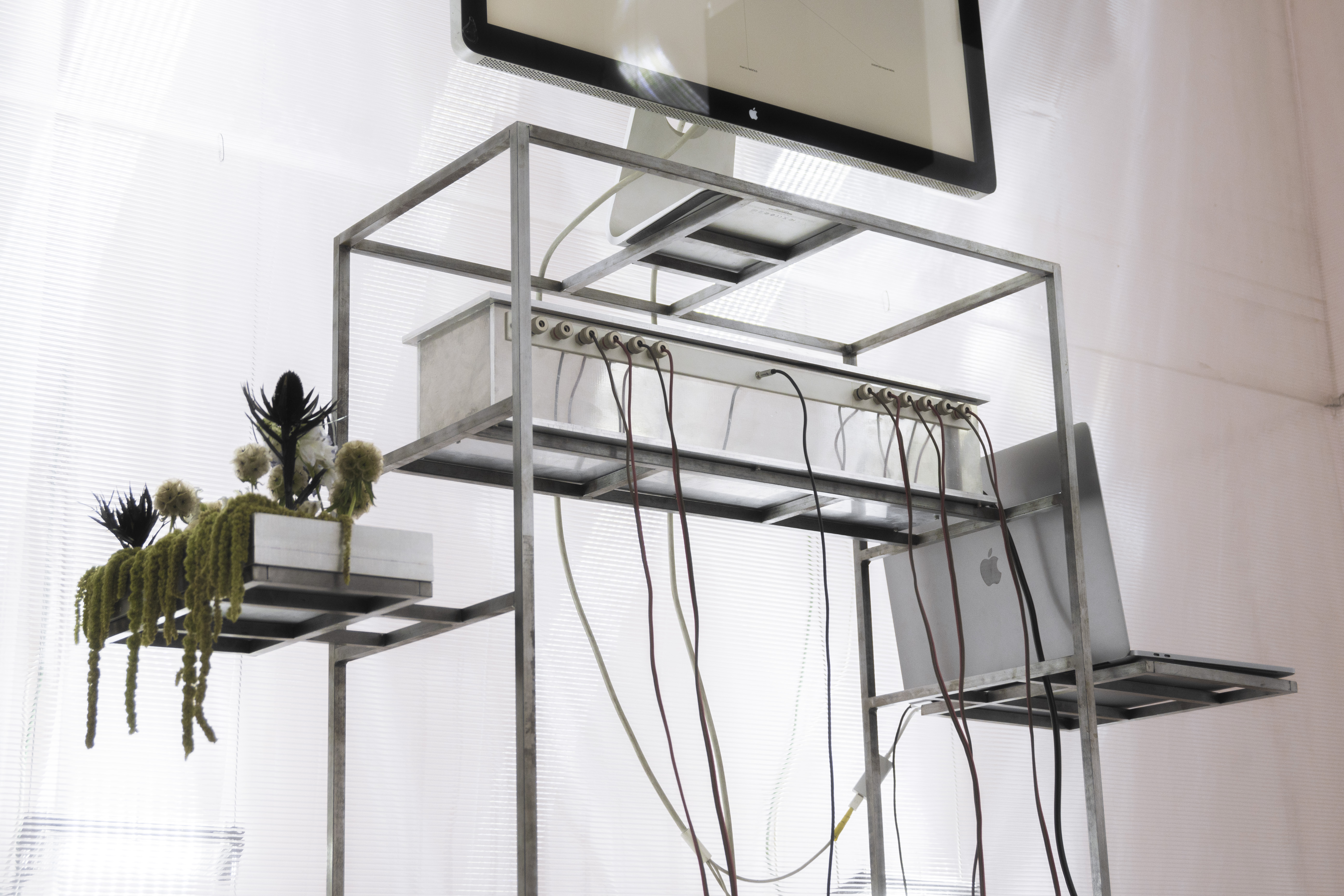 además del sistema suspendido, se diseñaron piezas auxiliares específicas: mesas de trabajo, muebles de almacenaje, lámparas, sillones individuales y mesas bajas. todos los objetos siguen una misma lógica estructural a partir de perfiles metálicos delgados y materiales translúcidos, lo que permite que el conjunto se mantenga liviano, permeable y reconfigurable.