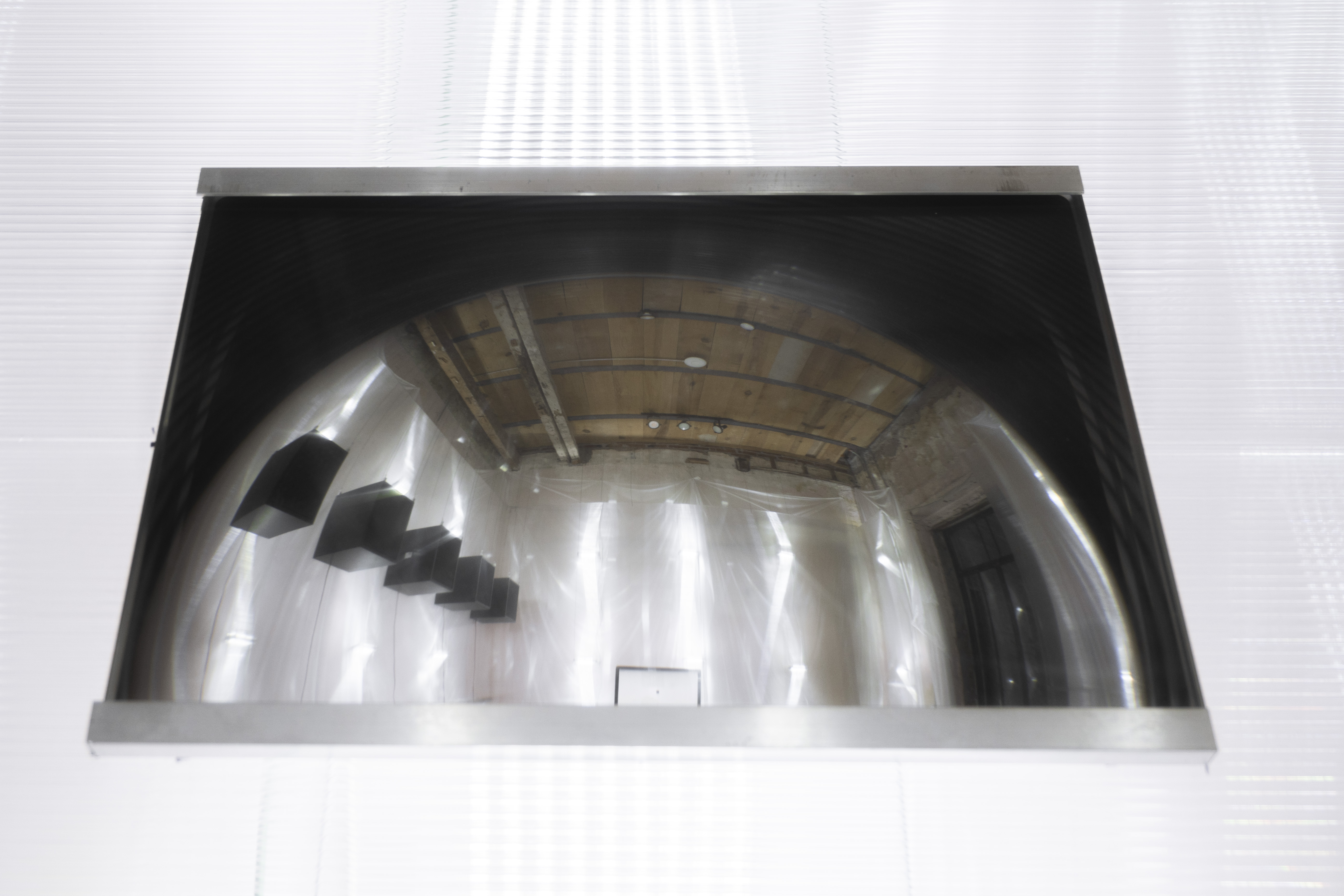 una retícula aérea de cables de acero tensada entre armellas permite colgar luminarias, pantallas de policarbonato, dispositivos de sonido y elementos de control espacial sin fijaciones permanentes. toda la intervención puede desmontarse rápidamente soltando los cables de acero de su punto de anclaje.