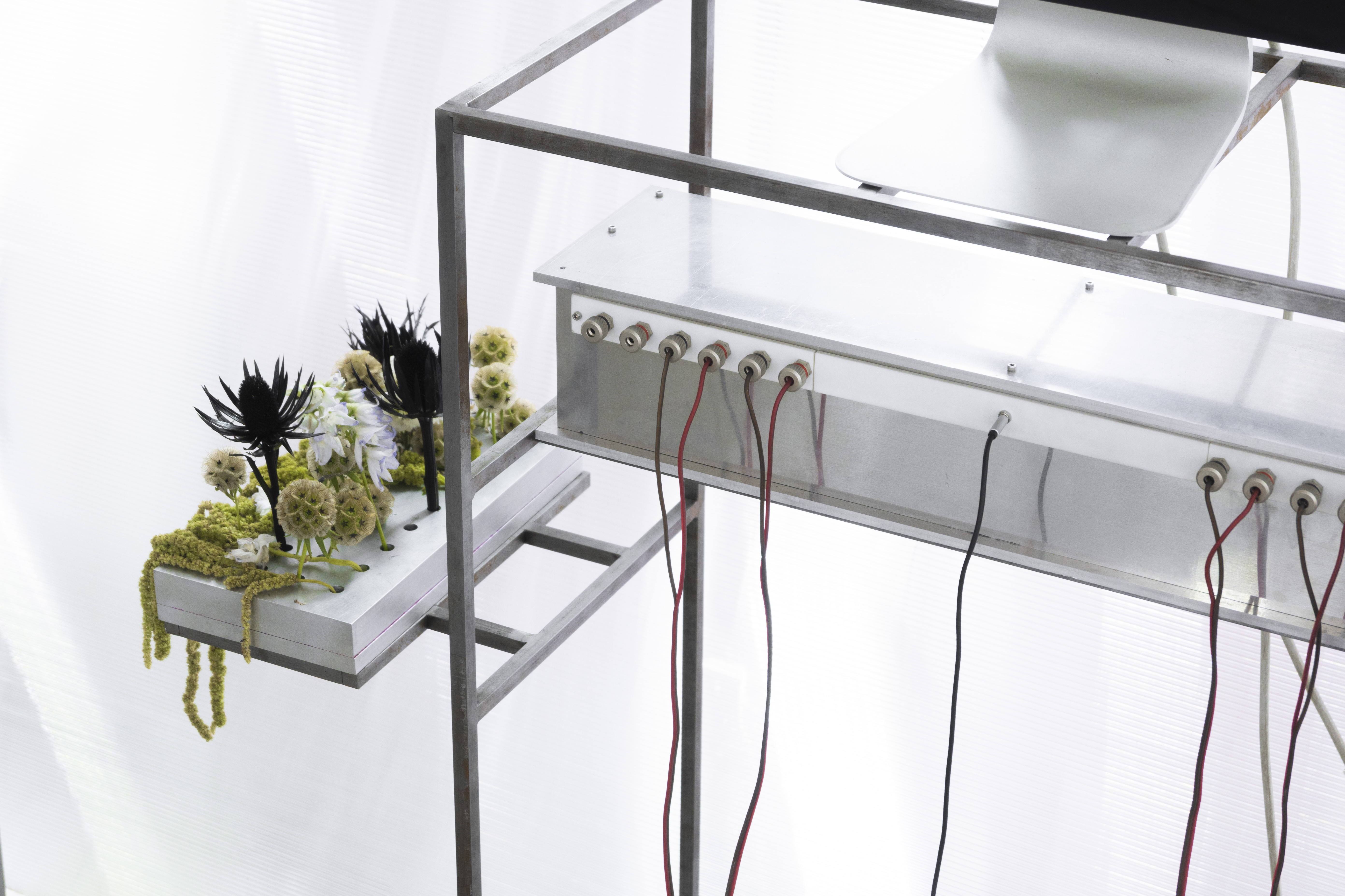 en complément du système suspendu, des pièces auxiliaires spécifiques ont été conçues : tables de travail, meubles de rangement, lampes, fauteuils individuels et tables basses. tous les éléments suivent une même logique structurelle à base de profils métalliques fins et de matériaux translucides, garantissant légèreté, perméabilité et modularité.